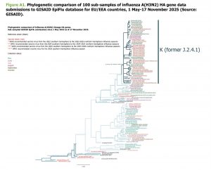 Otra de las peculiaridades de esta temporada es que se detecta un claro predominio del virus de la gripe A(H3N2), de una clase concreta, la K. Aunque el virus A(H1N1) predominó en la temporada de gripe de este año en el hemisferio sur y la clase K de A(H3N2) despegó solo al final, acabó siendo predominante en Reino Unido y en Japón: cerca del 90% de las muestras de gripe en estos países ya son A(H3N2) clase K. La misma tendencia parece que está ocurriendo en Estados Unidos y en Canadá. Este grupo K de A(H3N2) (anteriormente denominado J.2.4.1) se ha detectado ya en todos los continentes y representa un tercio de todos los virus A(H3N2) analizados entre mayo y noviembre de 2025 a nivel mundial, y casi la mitad en la Unión Europea.